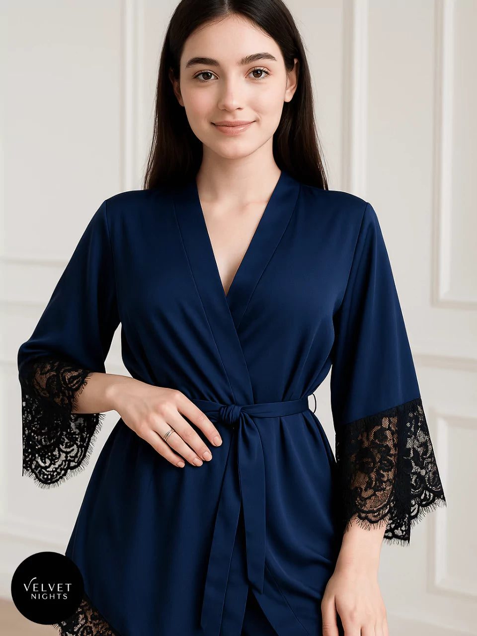 Step into elegance with this luxurious navy blue satin robe, adorned with delicate black lace trim on the sleeves and hem. The silky smooth fabric drapes effortlessly over the body, while the adjustable satin belt allows you to cinch the waist for a flattering silhouette.