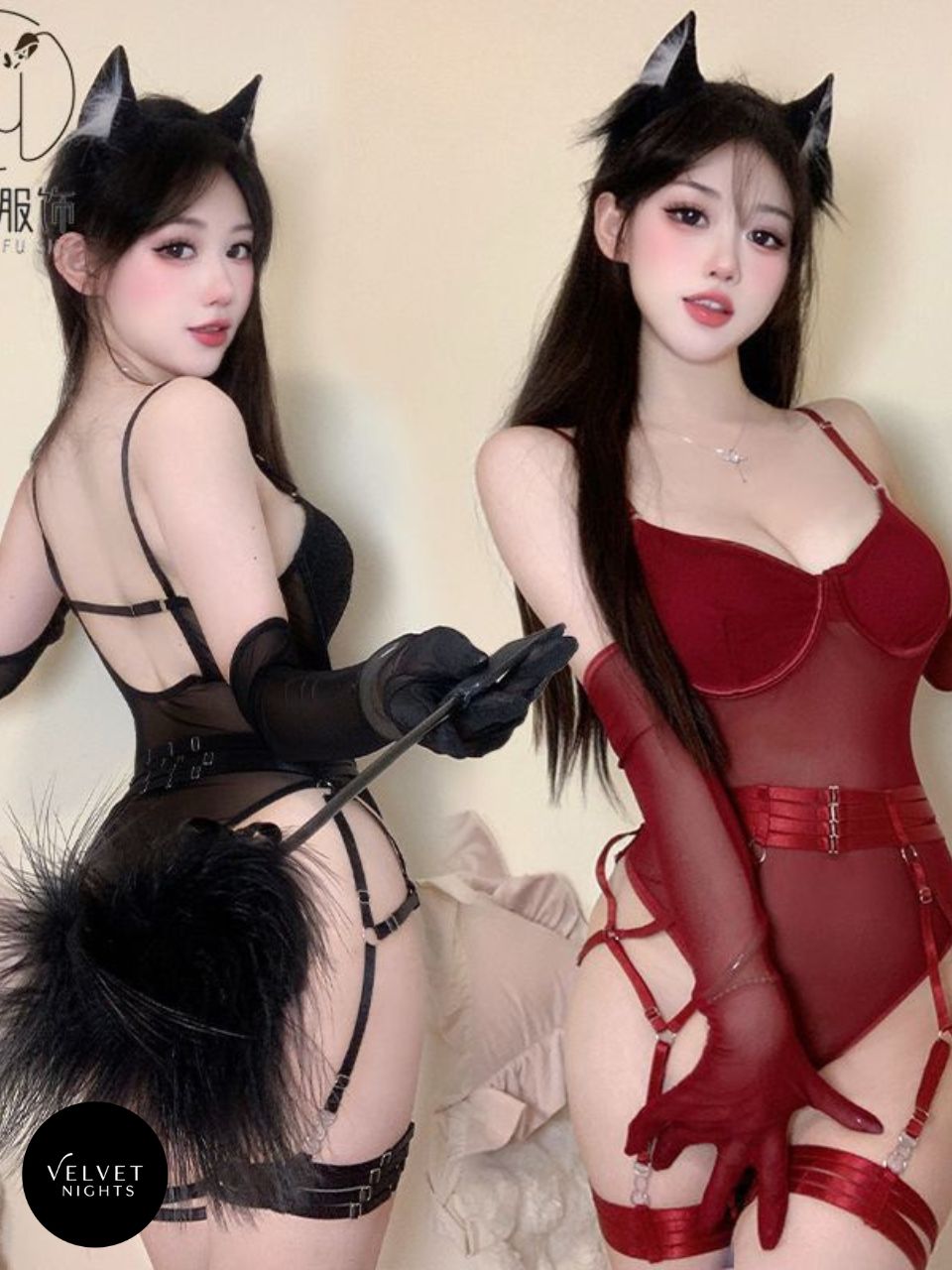 Set Includes: Bodysuit, mesh gloves, detachable garter straps