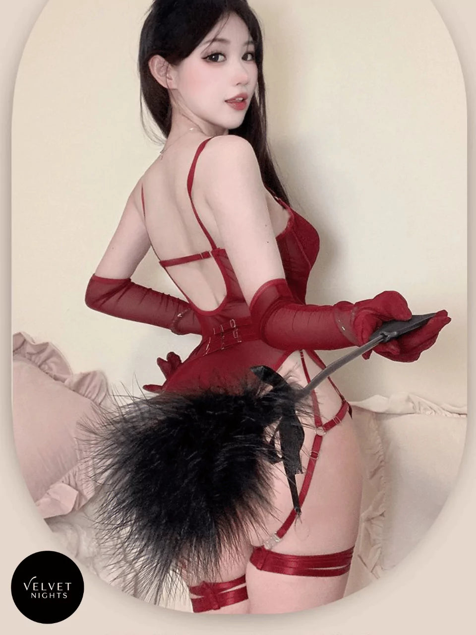 Command attention and ignite desire in the Scarlet Seduction Bodysuit. Crafted from smooth, stretch mesh in a rich wine red and black shade, this one-piece features underwired cups for lifted support and sculpted shaping. The sleek silhouette is accentuated with high-cut sides and adjustable garter straps that elongate the legs. Matching mesh gloves add a dramatic flair, while the back features a cheeky cut for a bold finish. Whether worn solo or styled with stockings, this bodysuit is your go-to for a confident, head-turning look.