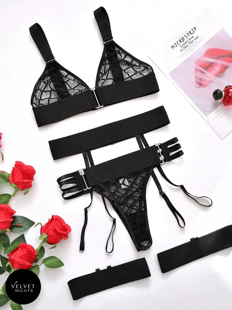 Channel seductive sophistication with the Noir Desire Net Lingerie Set. This 3-piece ensemble is designed with intricate diamond-patterned mesh and sleek black strapping for a look that's as bold as it is beautiful. The underbust band provides subtle support while the high-waisted garter belt cinches you in all the right places. Get ready to turn heads and steal hearts.